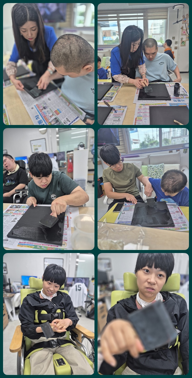 내손은 금손 놀부 데이드림팀 0 214 09.25 09:50 데이드림 공예 시간에 우리 손으로 ‘황금손’을 만들어 보았습니다. 공예 선생님께서 직접 준비해 주신 수제 풀을 손에 찍어 액자에 손모양을 남기고, 그 위에 반짝이는 금가루를 뿌려 멋진 황금손을 완성했어요. 비록 장애를 가진 친구들이지만, 이번 활동을 통해 **“우리도 금손이 될 수 있다”**는 자존감을 느끼며 즐겁고 의미 있는 시간을 보냈습니다.