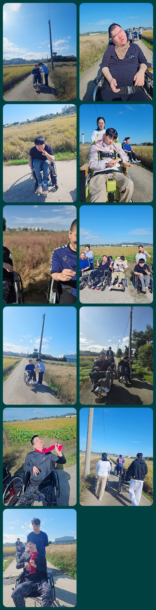 가을 바람과 함께 솔솔 퍼지는 가을 향기를 느끼며 오랜만에 들길 산책에 나섰습니다. 논에는 황금빛 벼이삭이 고개를 숙이며 가을의 풍요로움을 전하고, 감나무에는 주황빛 감이 먹음직스럽게 익어가고 있었습니다. 시각장애를 가진 영환 씨에게는 들풀과 벼이삭을 직접 손으로 만져보게 하며 가을의 감촉을 전해주었고, 곱게 자란 들풀을 꺾어 손끝으로 느낄 수 있도록 도와주었습니다. 영환 씨는 “정말 오랜만에 나오는 산책이라 너무 기분이 좋아요.”라며 밝은 미소를 지어 보였습니다.