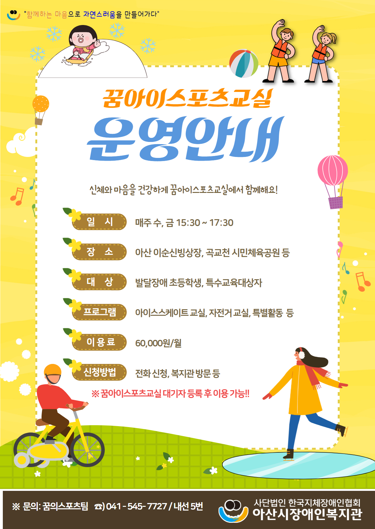 꿈아이스포츠교실 대기자 모집 및 운영 안내 0 3 5시간전 모집대상 초등학교 재학 중인 발달장애인 또는 특수교육대상자 진행일시 1년 접수기간 항시 이용료 월 60,000원 모집인원 00명 [꿈아이스포츠교실 대기자 모집 및 운영안내]