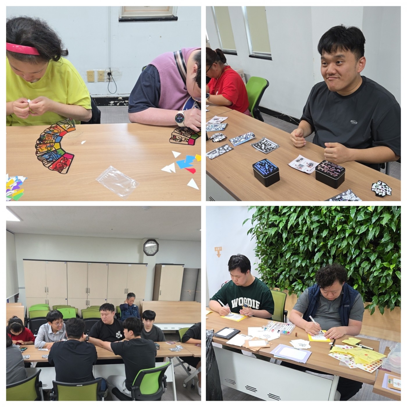낮활동지원 9월 아트활동 이찬빈 낮활동지원팀 0 149 09.30 13:59 9월 아트 활동 시간에는 감성이 담긴 다양한 작품들을 만들었습니다. 다채로운 색상의 스티커 재료를 활용해 따뜻한 분위기를 전해주는 무드등을 제작하였고, 추석을 맞아 소중한 분께 선물할 수 있도록 전통 자개함을 스티커로 꾸며 보았습니다. 활동을 마친 뒤에는 서로의 작품을 함께 감상하며 감동과 기쁨을 나누는 뜻깊은 시간을 가졌습니다.