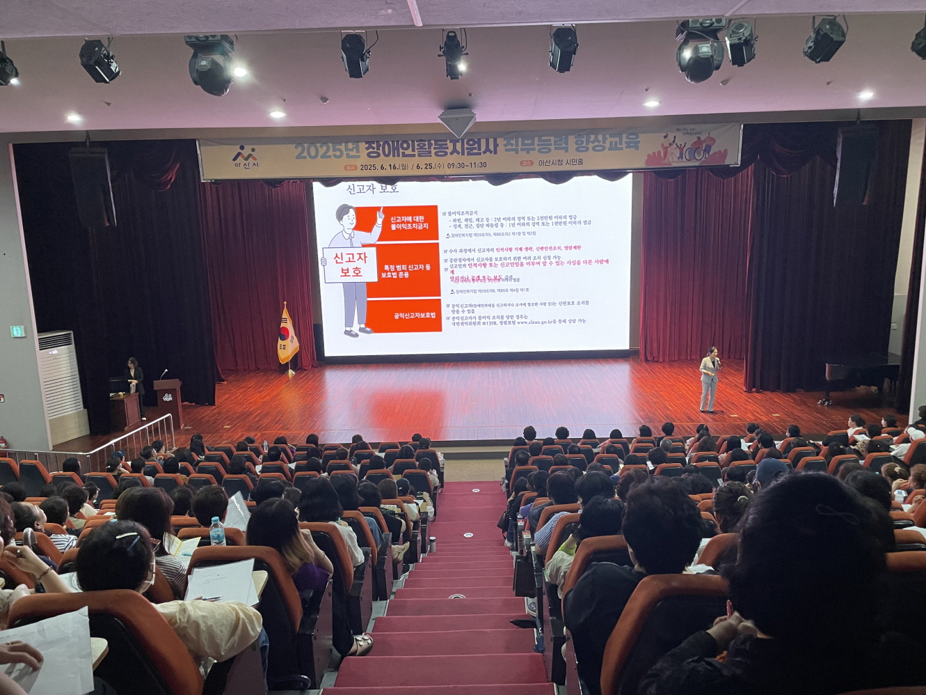 아산시청 주관 직무보수교육 김하영 활동지원팀 0 299 06.30 15:33 아산시청에서 주관하는 직무보수교육에 참석했습니다. 교육 주제는 장애인식개선교육, 장애인학대 예방 및 신고의무자교육, 부정수급 예방 및 청렴교육 3개로 진행되었습니다. 활동지원사 역걍 강화와 장애인활동지원서비스의 질적 향상을 위해 노력하고자 아산시 제공기관 연합하여 교육진행하였습니다. 앞으로도 활동지원 서비스 향상을 위해 노력하는 제공기관이 되겠습니다.